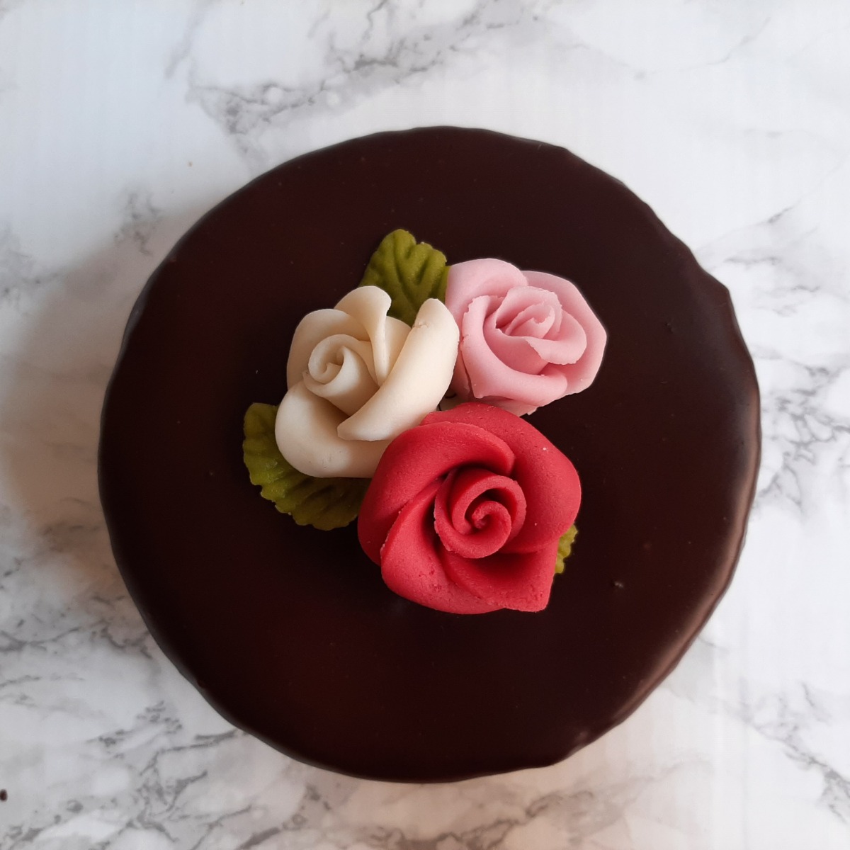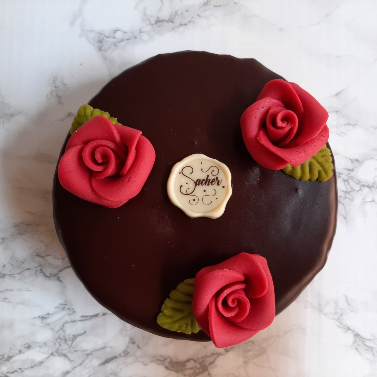 Laat je Sachertorte versieren met een aantal roosjes. Ieder roosje heeft ook een groen blaadje. Keuze uit een wit, rood of roze roosje.