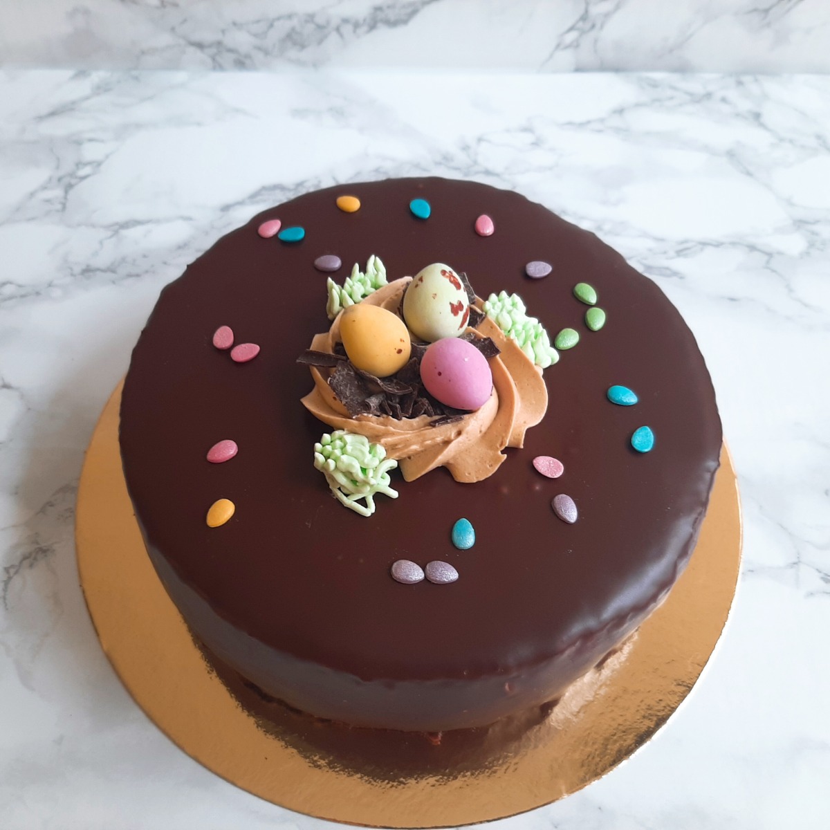 Onze bekende Sachertorte, maar dan feestelijk opgemaakt voor Pasen. In het midden een nestje met eitjes en daaromheen vrolijke eitjes-confetti.