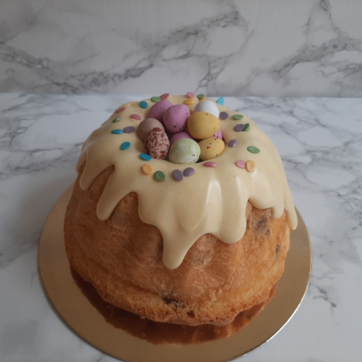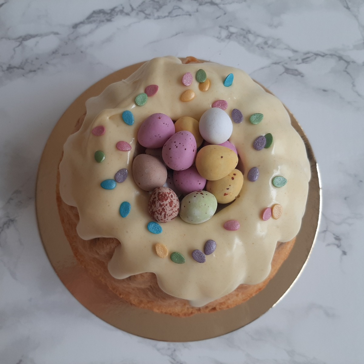 Klassieke Moskovische tulband mét of zonder rozijnen of met chocolade. Overgoten met licht geel glazuur, versierd met confetti met in het midden een nestje chocolade eitjes.